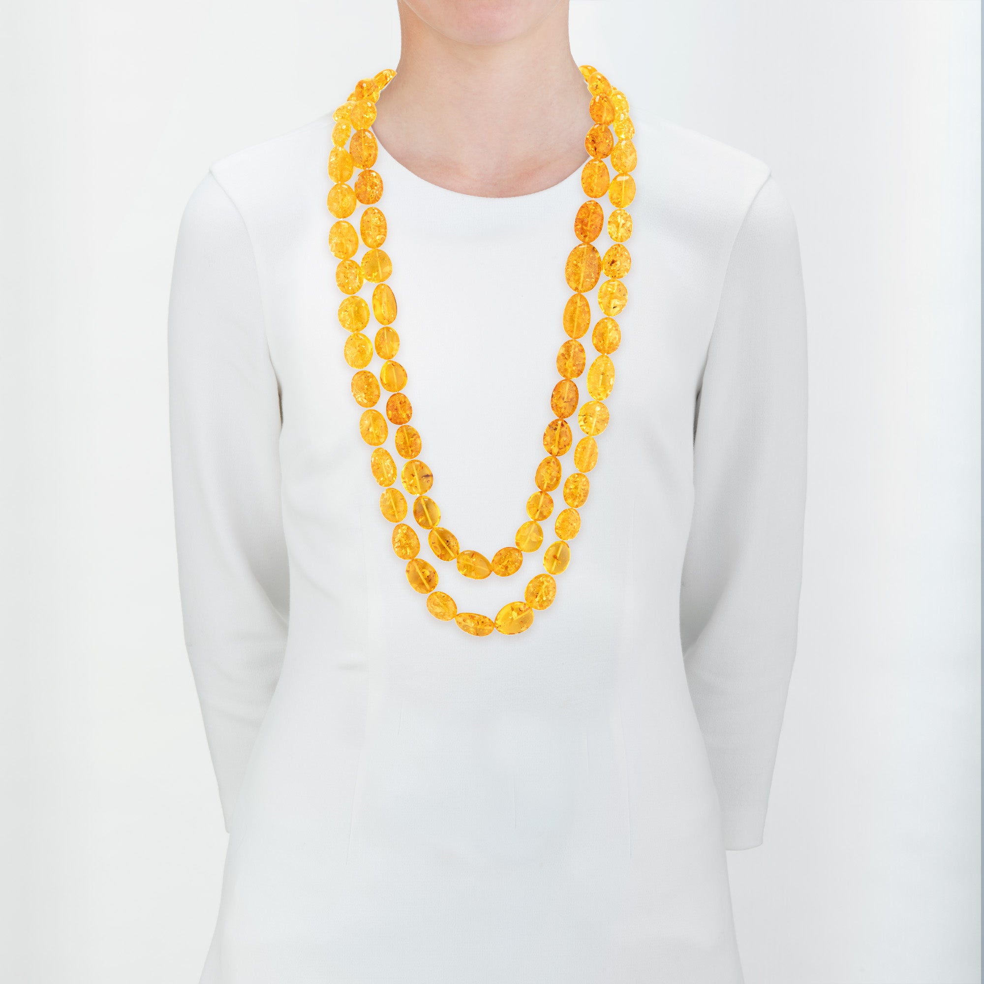This luminous honey gold Baltic amber necklace captures the ancient warmth of sun-drenched resin, frozen in time from primordial forests millions of years ago. Each polished bead, with its translucent golden glow and subtle inclusions like whispers of trapped light, rests softly against the skin, evoking embers or liquid sunlight—visceral and effortlessly sensual. Strung in a graceful, timeless strand, it enhances the wearer's natural allure without overwhelming, a striking heirloom that feels both eternal and intimately personal, perfect for quiet empowerment from daylit walks to evening gatherings. Wear one strand or both short or long.